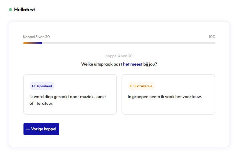 Een persoonlijkheidstest is een gestandaardiseerde vragenlijst die jouw gedragspatronen, drijfveren en eigenschappen in kaart brengt. Bij sollicitaties en assessments wordt zo’n test gebruikt om te bepalen of jij past bij de functie en de organisatiecultuur.