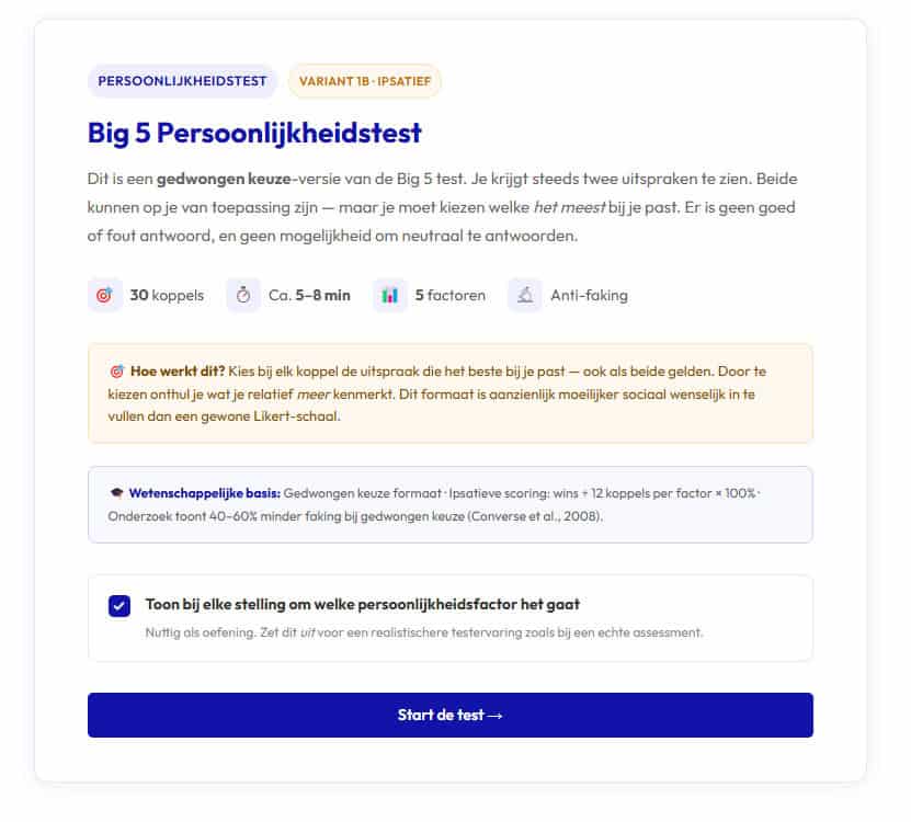 Big Five (ipsatief – forced-choice) | Ja | Gedwongen keuze formaat · Converse et al. (2008). Onderzoek toont 40-60% minder sociaal-wenselijk antwoorden bij gedwongen keuze versus Likert-schaal. Ipsatieve scoring: wins per factor / totaal koppels × 100%. |