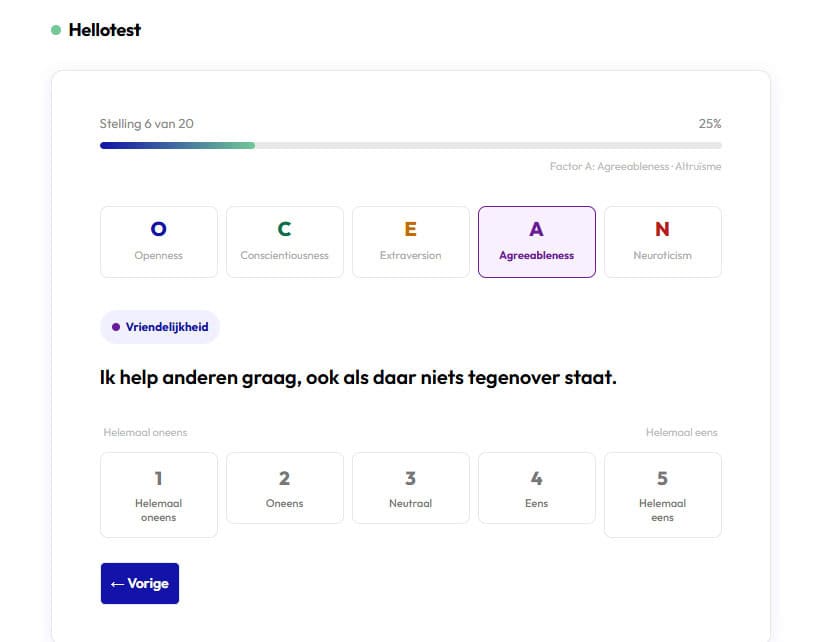 Ontdek jouw persoonlijkheidsprofiel op de vijf wetenschappelijke dimensies: Openheid, Consciëntieusheid, Extraversie, Agreeableness en Neuroticisme. In 20 stellingen krijg je een eerste indruk. Voor je volledige rapport met gedetailleerde interpretaties doe je de uitgebreide versie.