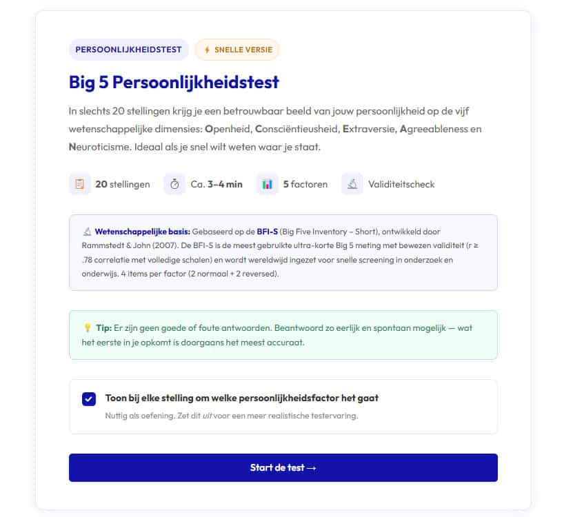 Big Five (normatief – snel) | Ja | BFI-S · Rammstedt & John (2007). 20 items, 4 per factor (2 normaal + 2 reversed). Bewezen validiteit r ≥ .78 correlatie met volledige schalen. Meest gebruikte ultra-korte Big 5 meting in onderzoek en HR-screening wereldwijd. |