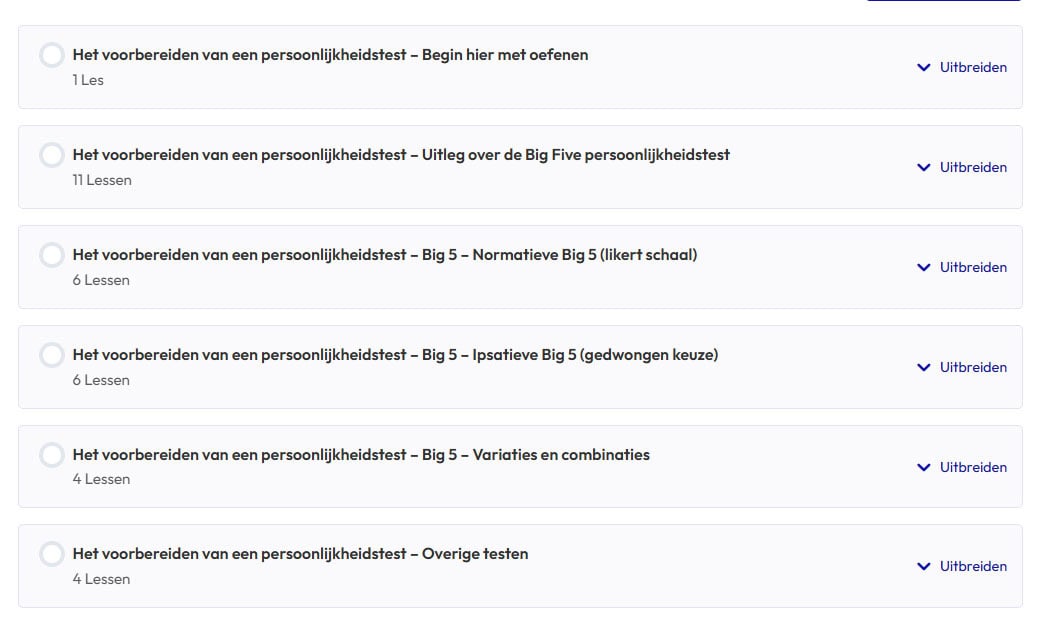 Heb jij binnenkort een persoonlijkheidstest als onderdeel van jouw sollicitatieprocedure? Veel kandidaten vinden de persoonlijkheidstest spannend. Daarom hebben wij een cursus ontwikkeld waarin jij 20+ verschillende testen kunt oefenen. Dat vermindert stress, verhoogt zelfvertrouwen en zorgt dat jij een eerlijk beeld van jezelf kan geven. Start nu nog met voorbereiden voor jouw persoonlijkheidstest.